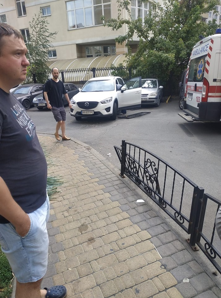 ДТП случилось в четвег, 22 августа во дворе дома 19А на Днепровской набережной в Киеве. Это район элитных высоток на Осокорках. Белый кроссовер на огромной скорости задним ходом наехал на людей.
