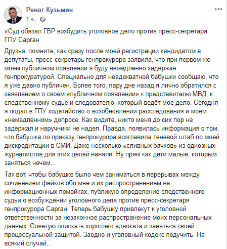 "Суд обязал ГБР возбудить уголовное дело против пресс-секретаря ГПУ Сарган. Друзья, помните, как сразу после моей регистрации кандидатом в депутаты, пресс-секретарь генпрокурора заявила, что при первом же моем публичном появлении я буду немедленно задержан генпрокуратурой. Специально для неадекватной бабушки сообщаю, что я уже давно публичен", — написал он.