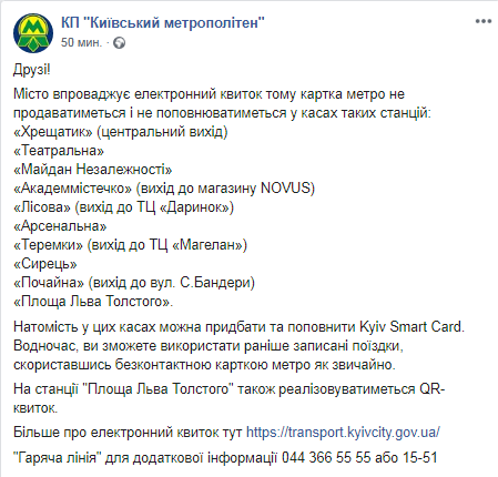 Причина таких нововведений - внедрение электронного билета. В кассах на указанных станциях можно будет приобрести и пополнить Kyiv Smart Card. Также можно будет использовать ранее приобретенные поездки, воспользовавшись бесконтактной карточкой метро как обычно.