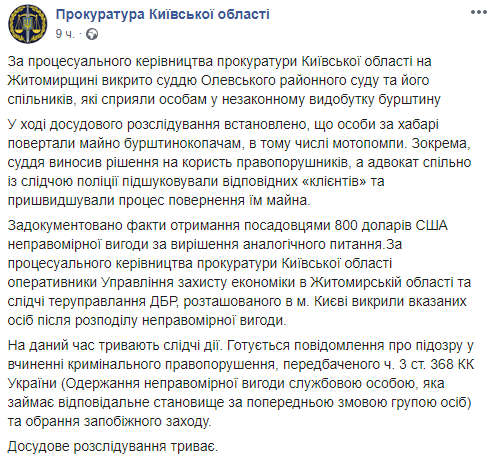 В Житомирской области разоблачили судью Олевского районного суда и его сообщников, которые способствовали незаконной добыче янтаря. Об этом сообщается на странице прокуратуры Киевской области в соцсети.