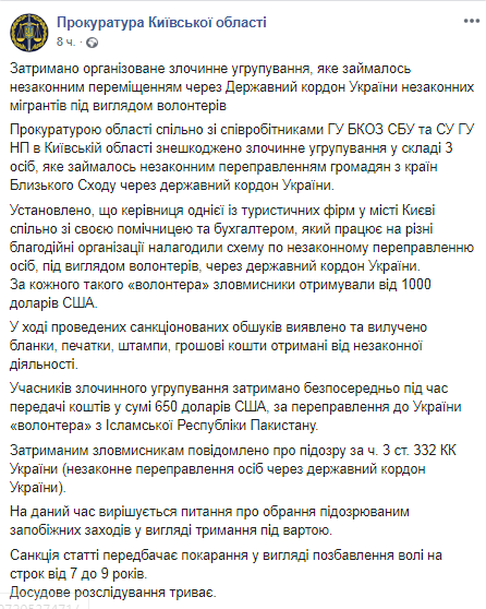 По данным прокуратуры, руководитель одной из туристических фирм в Киеве совместно со своей помощницей и бухгалтером, который работает на различные благотворительные организации, наладили схему по незаконной переправке лиц под видом волонтеров через государственную границу Украины. За каждого такого "волонтера" злоумышленники получали от 1000 долларов.