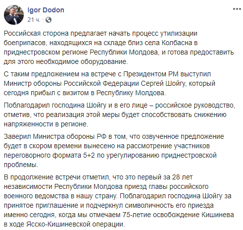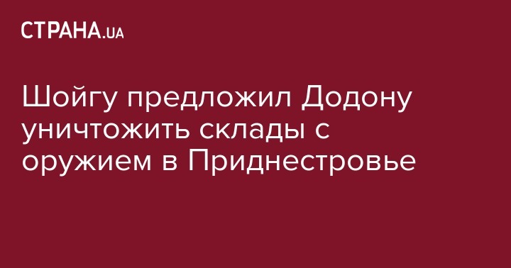 Министр обороны РФ Сергей Шойгу предложил президенту Молдовы Игорю Додону начать процесс утилизации боеприпасов, которые хранятся на складе недалеко от села Колбасна в Приднестровье. Об этом Додон написал в Facebook.