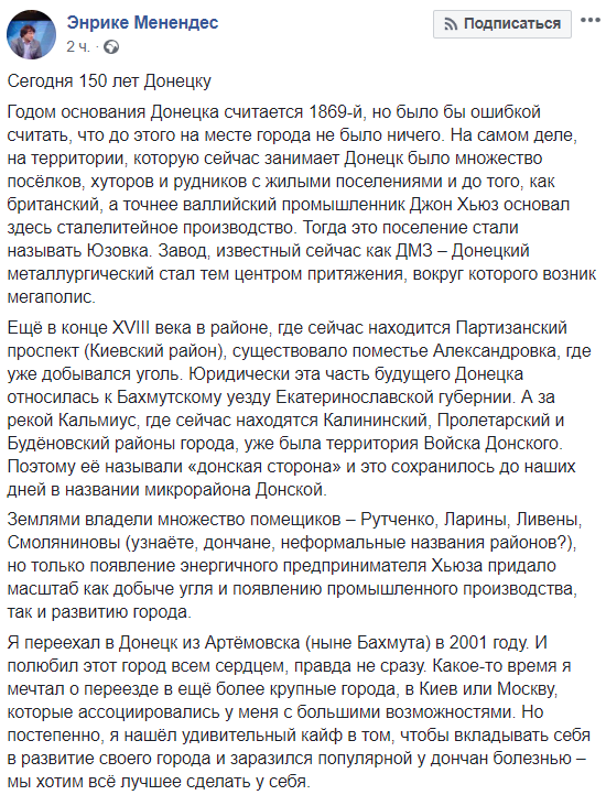 А сегодня я от всего сердца поздравляю всех дончан со 150-летием города и всех шахтёров с профессиональным праздником. Мы переживём эти смутные времена, как это уже бывало раньше. Я ни капли не сомневаюсь в блестящем будущем, как Донецка, так и всего Донбасса.