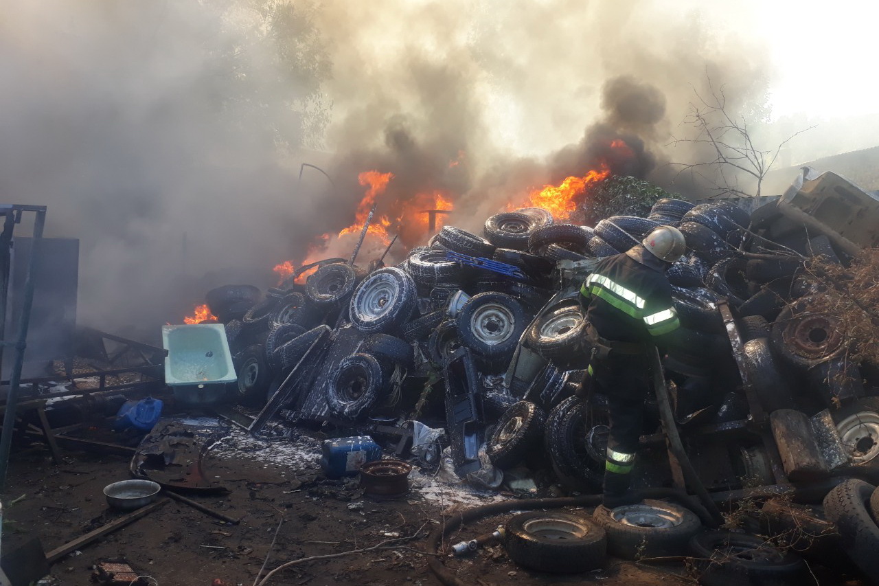 Пожарные прибыли на место происшествия, где на открытой территории горели старые автомобильные шины и несколько автомобилей. Общая площадь пожара составляла около 300 кв.м.