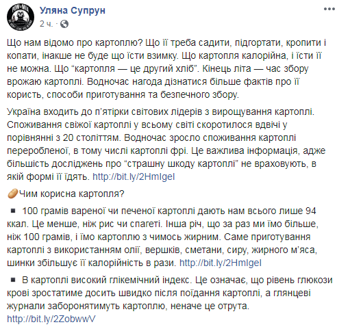 И. о. министра здравоохранения Уляна Супрун рассказала, как правильно собирать и готовить картофель.  способах его приготовления и безопасного сбора. Об этом говорится на ее фб-странице.