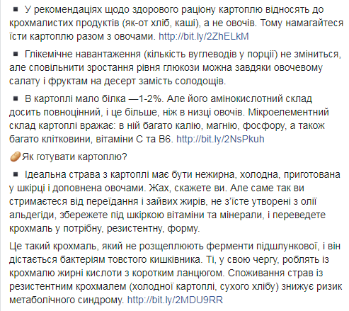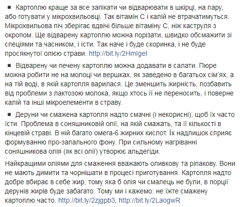 "Идеальное блюдо из картофеля должно быть нежирным, холодным, приготовленным в кожуре и дополненным овощами. Ужас, скажете вы. Но именно так вы сдерживайтесь от переедания и лишних жиров, не съедите образованные из масла альдегиды, сохраните (...) витамины и минералы и переведете крахмал в нужную, резистентную форму", - отмечается в опубликованном сообщении.
