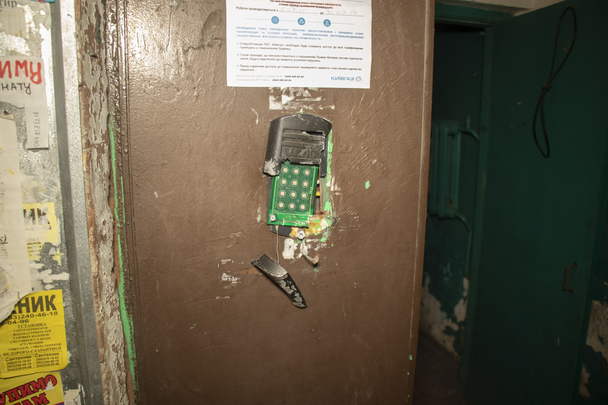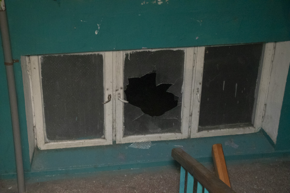 Во время скандала мужчина бросил в женщину банку с краской и ведро. После этого он взял кувалду и начал громить все вокруг. Больше всего пострадал домофон и вход в парадное. Также на лестнице были разбиты стекла.