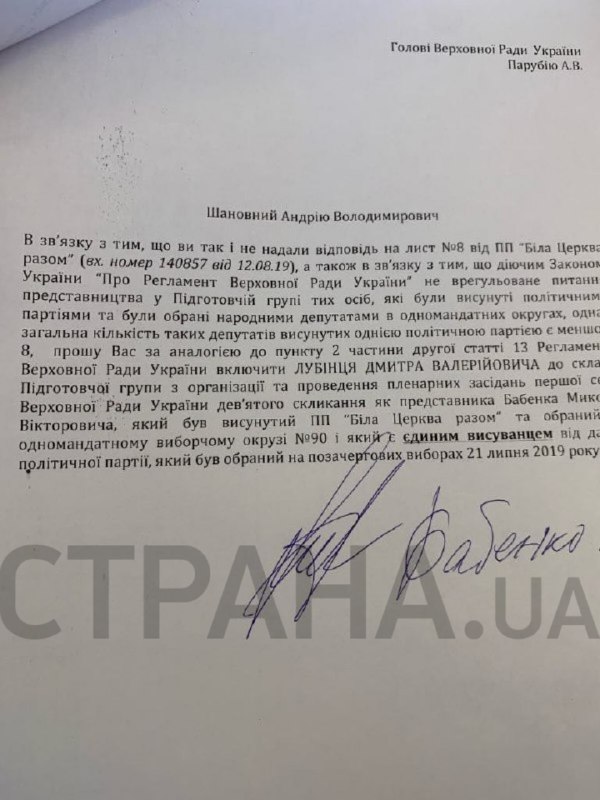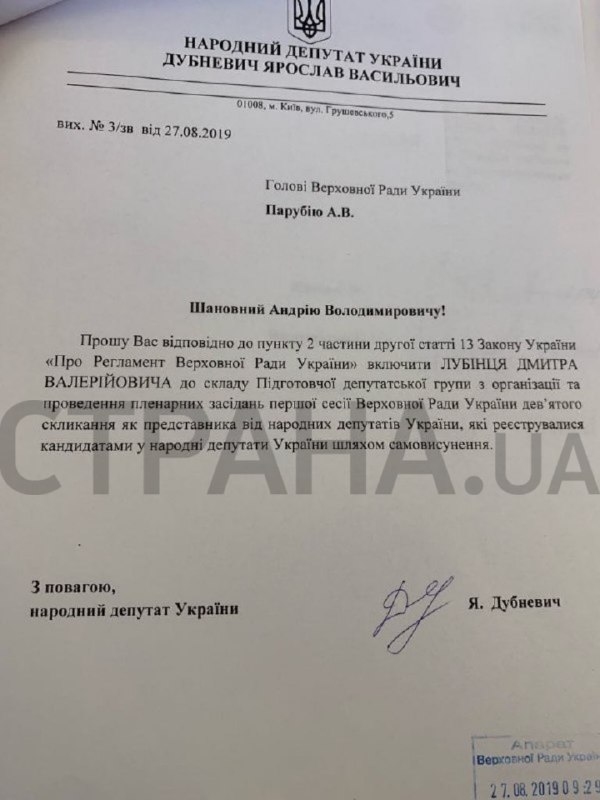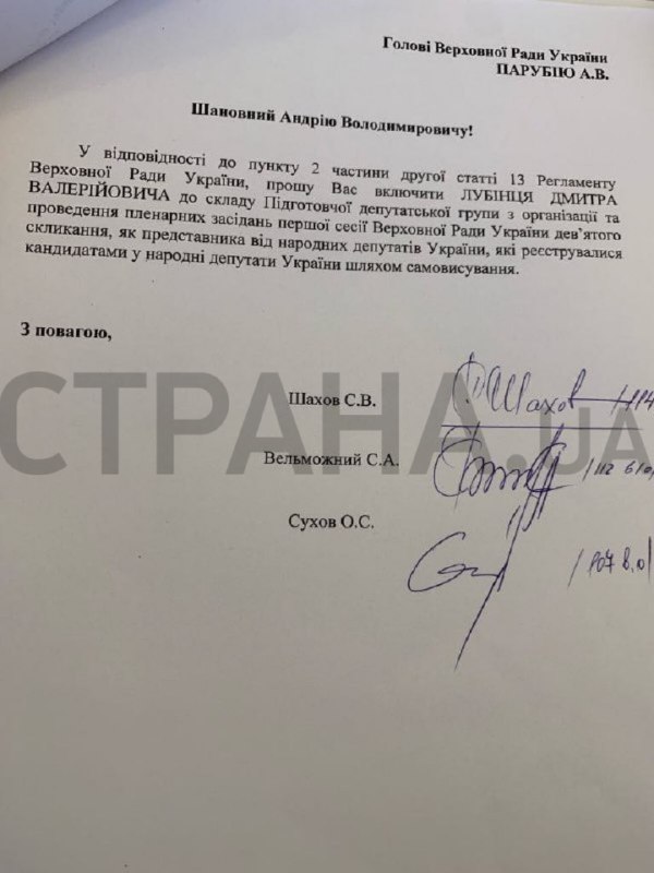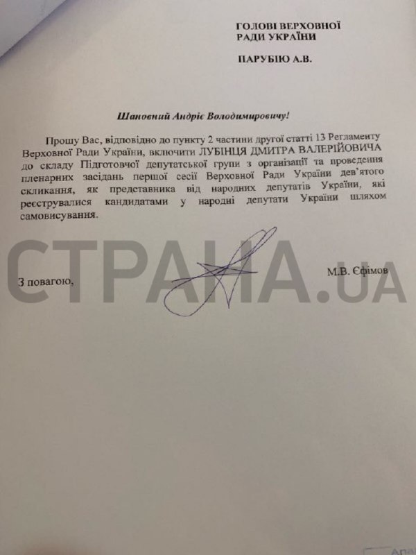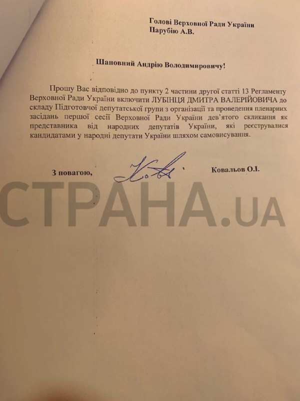 В документе они просят ввести в состав подготовительной группы Дмитрия Лубинца (по данным "Страны" - человек Авакова).