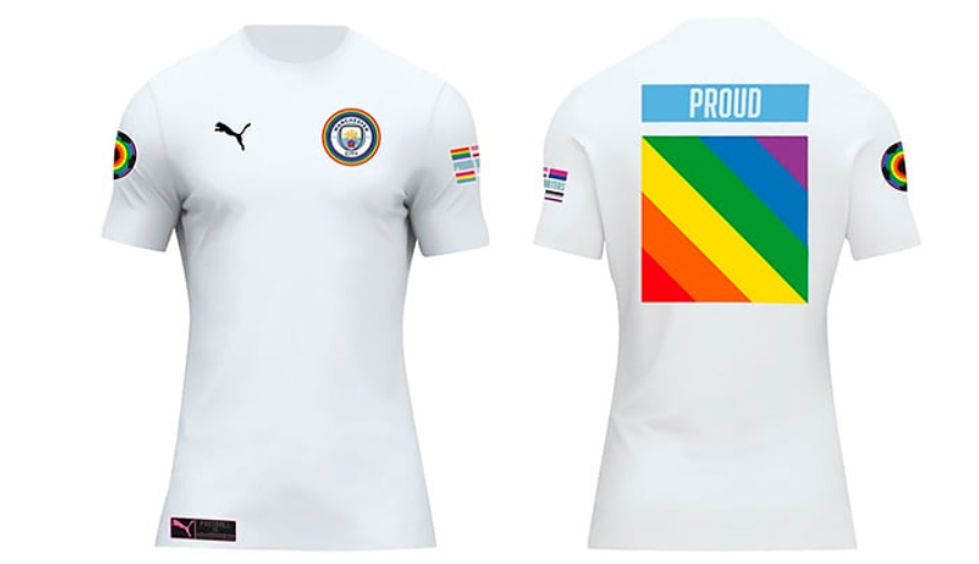 На белой футболке, вокруг эмблемы "горожан" находится радужная окантовка. Также на футболке помещена надпись "Together We Stand" ("Вместе выстоим" - Ред.) и логотип организации "Футбол против гомофобии". На спине размещен флаг ЛГБТ и надпись "Proud" ("Горжусь" - Ред.), выделенная светло-голубым цветом.