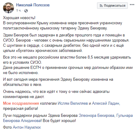 Напомним, 12 декабря 2018 года при въезде в Крым силовики РФ 12 декабря задержали гражданина Украины, крымскотатарского активиста Эдема Бекирова. Бекиров - один из крымскотатарских общественных активистов поселка Новоалексеевка. Его жена, Гульнара, является членом Меджлиса крымскотатарского народа. В январе 2018 года Эдем перенес операцию на сердце, в ходе которой ему были установлены 4 шунта. Кроме того, он носит съемный протез на правой ноге (ниже колена).