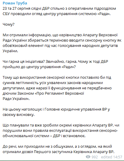 По словам Трубы, силовики проводили осмотр центра управления системой "Рада" после того, как получили информацию, что руководство Аппарата Верховной Рады Украины собирается срочно вводить сенсорную кнопку как обязательный элемент во время голосования народных депутатов Украины.