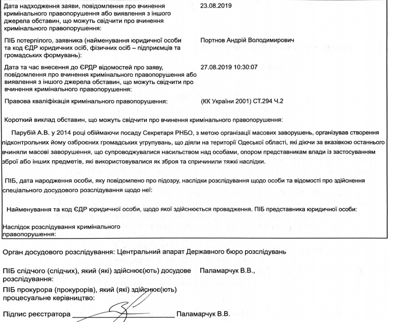 "Парубий А.В. в 2014 году, занимая должность секретаря СНБО, с целью организации массовых беспорядков, организовал создание подконтрольных ему гражданских группировок, которые действовали на территории Одесской области, которые действуя по указанию последнего учиняли массовые беспорядки, которые сопровождались насилием над лицами, сопротивлением представителям власти с применением оружия и других предметов, которые использовались как оружие та повлекли тяжелые последствия", - говорится в материалах уголовного производства.