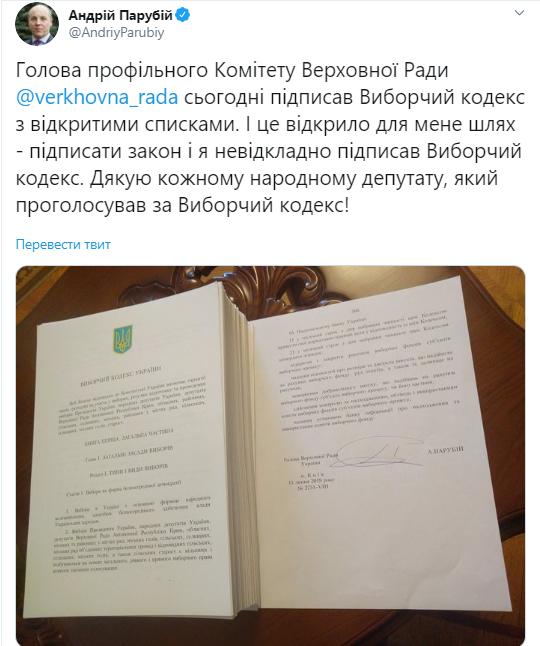 "Глава профильного комитета Верховной Рады сегодня подписал Избирательный кодекс с открытыми списками. И это открыло для меня путь подписать закон, и я безотлагательно подписал Избирательный кодекс", - написал Парубий и добавил фото документа со своей подписью.