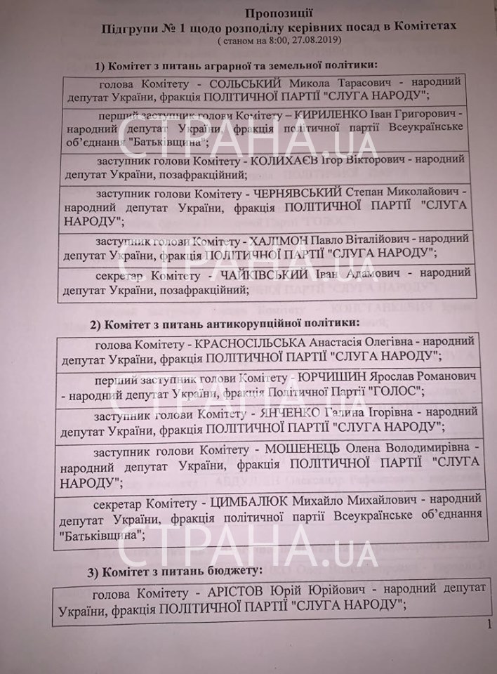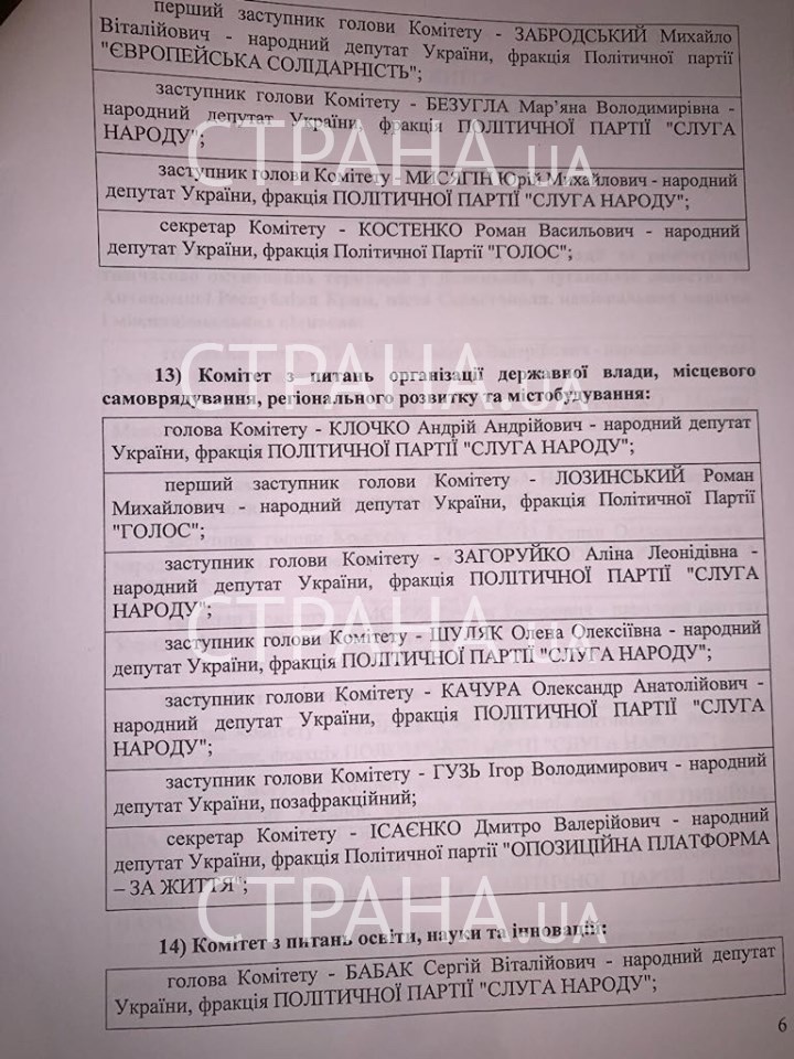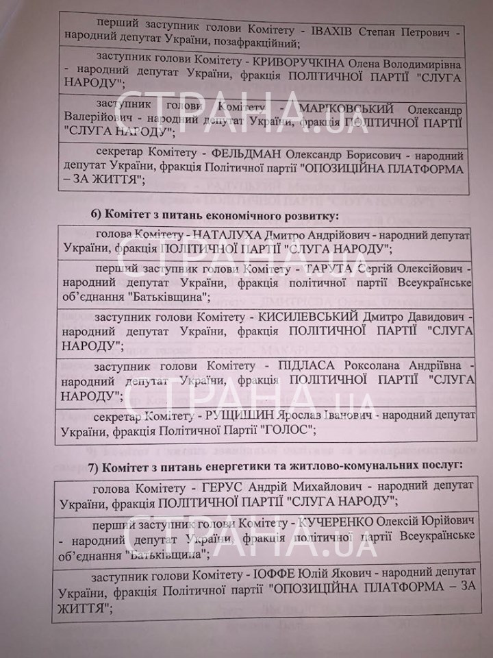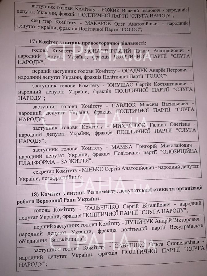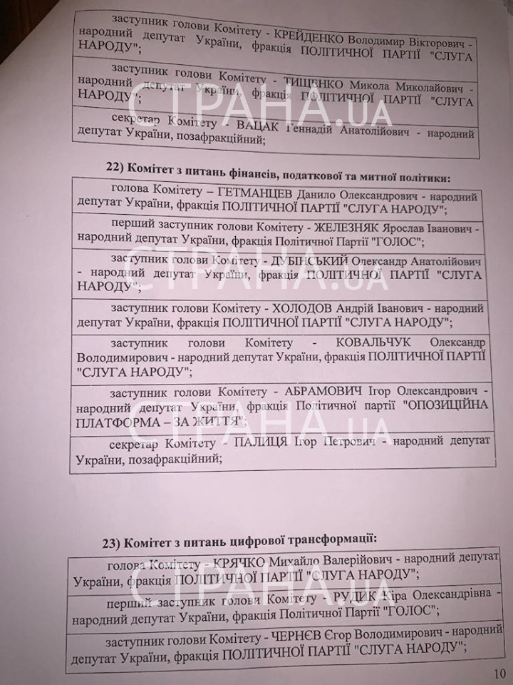 Итого, как сообщал ранее источник "Страны", народные депутаты от президентской партии возглавят 19 комитетов. По одному комитету у "Оппозиционной платформы - За жизнь", "Европейской солидарности, "Батькивщины"; одним комитетом будет управлять внефракционный нардеп.