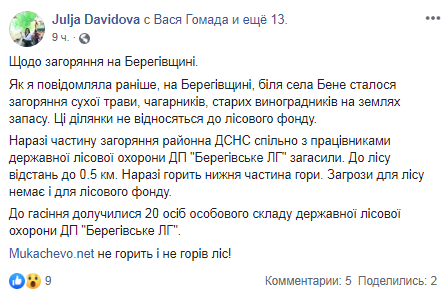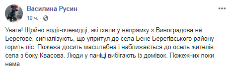 Пользователь Facebook Василина Русин сообщила, что у села Бене Береговского района горит лес и опубликовала снимки. Однако пресс-секретарь Закарпатского облуправления лесного хозяйства Юлия Давыдова заявила, что горит не лес, а кустарники и виноградники.