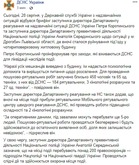 По состоянию на утро среды, 28 августа, под завалами обрушившегося ночью жилого дома в Дрогобыче могут быть пять человек. Об этом в Facebook сообщает пресс-служба ГСЧС Украины.
