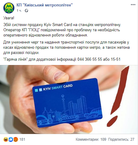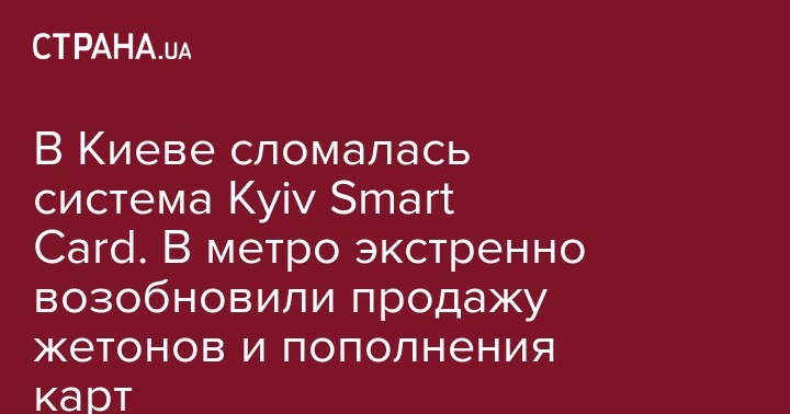 Утром в четверг, 29 августа, в Киеве произошел сбой системы продажи Kyiv Smart Card, поэтому там, где ранее перестали продавать карты метро и жетоны, возобновили их реализацию. Об этом сообщает пресс-служба КП "Киевский метрополитен" в Facebook.
