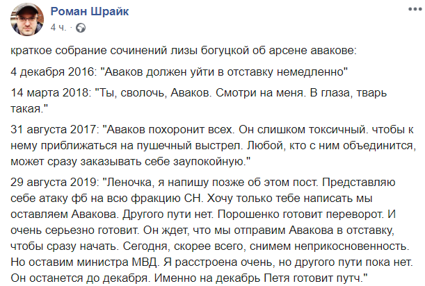 29 августа 2019: "Леночка, я напишу позже об этом пост. Представляю себе атаку фб на всю фракцию СН. Хочу только тебе написать мы оставляем Авакова. Другого пути нет. Порошенко готовит переворот. И очень серьезно готовит. Он ждет, что мы отправим Авакова в отставку, чтобы сразу начать. Сегодня, скорее всего, снимем неприкосновенность. Но оставим министра МВД. Я расстроена очень, но другого пути пока нет. Он останется до декабря. Именно на декабрь Петя готовит путч."