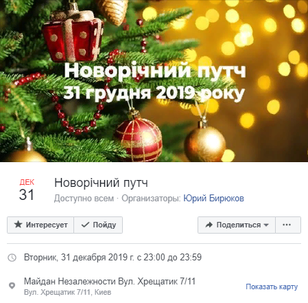 Организатором встречи указан бывший советник экс-президента Петра Порошенко Юрий Бирюков. "Мероприятие" должно состоятся во вторник, 31 декабря 2019 г. с 23:00 до 23:59 на майдане Независимости.