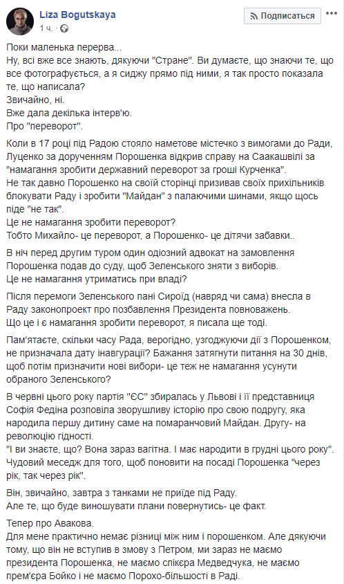 Напомним, сегодня на первом заседании Верховной Рады нового созыва нардеп Лиза Богуцкая кому-то написала в мессенджере, что главу МВД Арсена Авакова оставят на должности, чтобы не допустить переворота, который якобы планирует экс-президент Петр Порошенко.