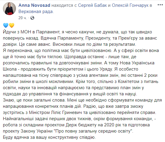 Получив высокую должность в Кабмине, Новосад поблагодарила коллег за аванс доверия. "Это именно аванс. Выводы только по действиям и результатам. Я убеждена, что политика должна быть цивилизованной", - написала Новосад в Facebook.