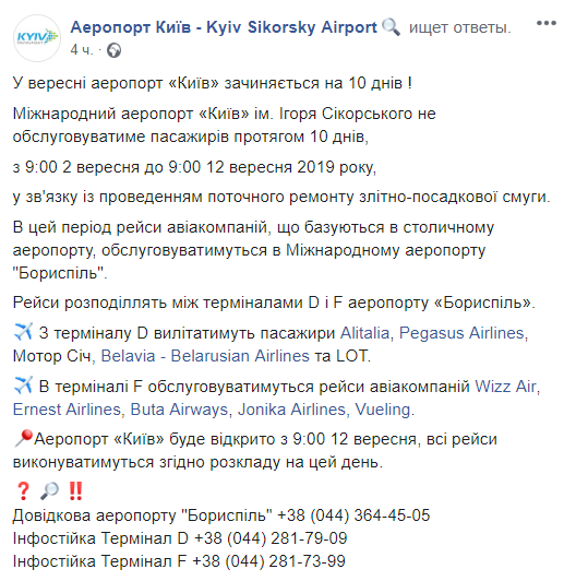 Международный аэропорт "Киев" им. Сикорского (Жуляны) закрывается на 10 дней - он не будет принимать и отправлять самолеты с 9:00 понедельника, 2 сентября по 12 сентября. Об этом аэропорт напомнил пассажирам на своей странице в соцсети.