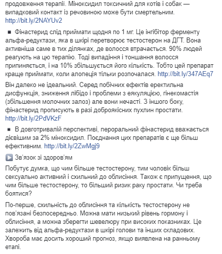Финастерид необходимо принимать каждый день по 1 мг. При этом 90% людей реагируют на эту терапию и у них прекращается выпадение и утоньшение волос. Кроме того, количество волос увеличивается на 10%. Супрун заявила, что данный препарат лучше принимать тогда, когда облысение только начинается