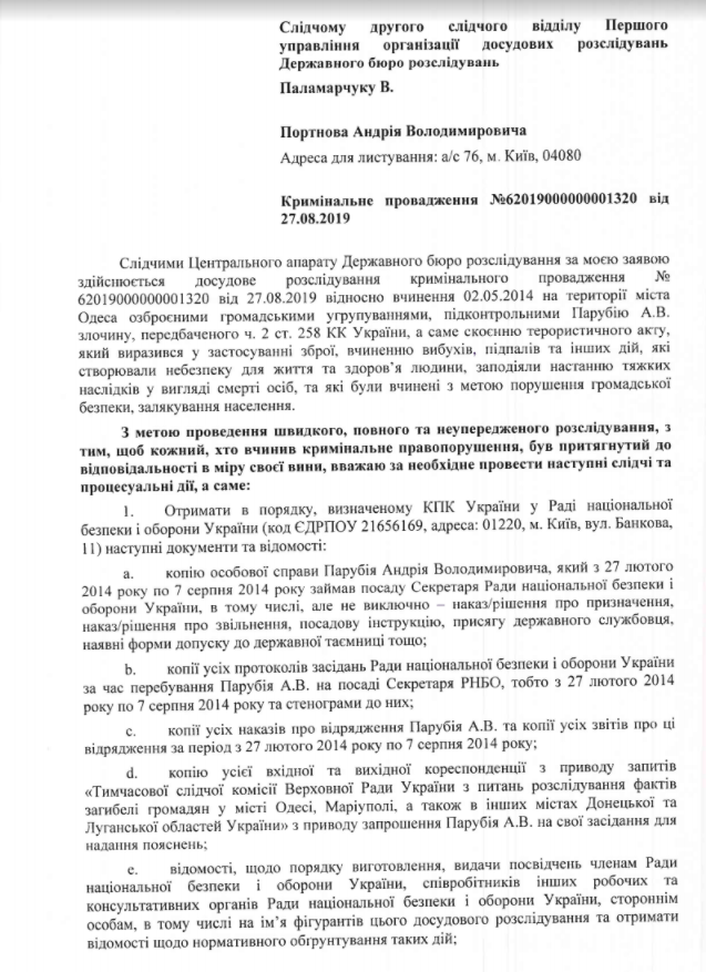 Известный юрист Андрей Портнов, который выступил заявителем в уголовном производстве, открытом ГБР против экс-спикера парламента Андрея Парубия по мотивам трагических событий в Одессе 2 мая 2014 года, направил в Госбюро расследований свое предложения по первоочередным следственным действиям.