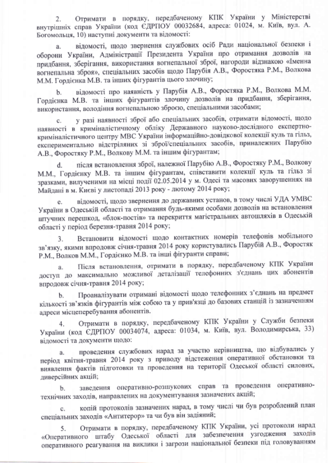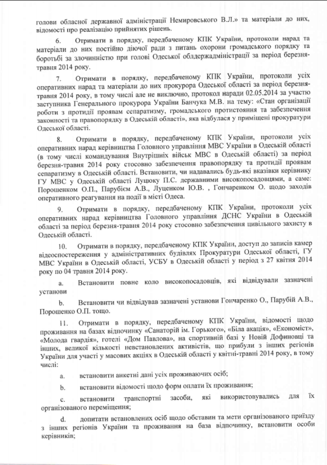 "Получить в порядке, предусмотренном УПК Украины, протоколы всех оперативных совещаний руководства ГУ МВД в Одесской области за период марта-апреля 2014 года касательно обеспечения правопорядка и противодействия проявлениям сепаратизма в Одесской области", - говорится в плане следственных действий, предложенных Портновым.