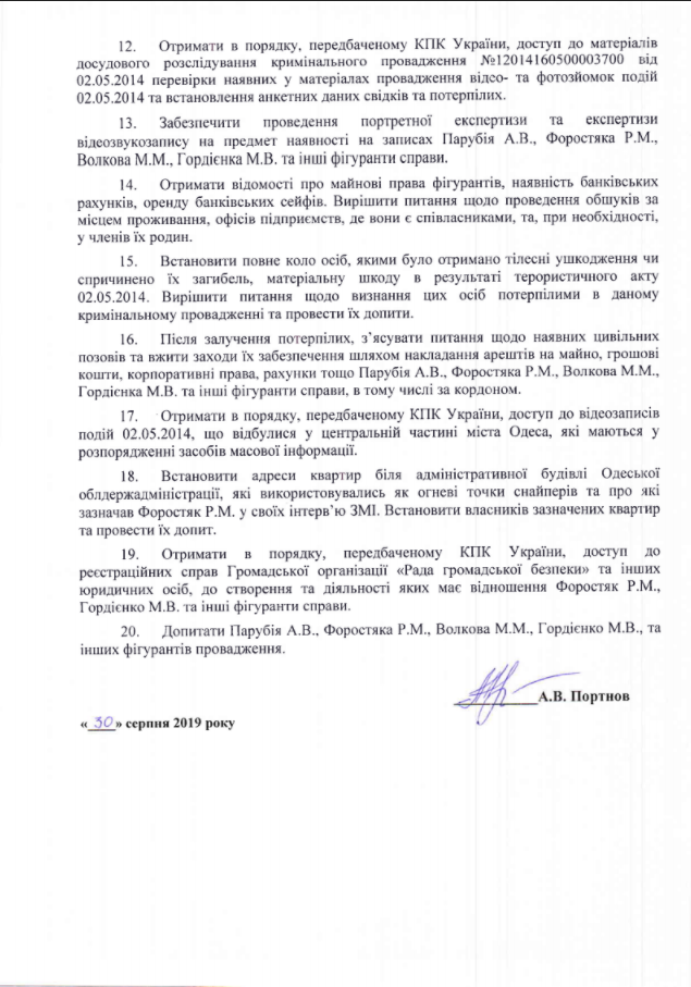 Во-вторых, Портнов считает целесообразным получение ГБР сведений о лицах, которых Портнов считает центральными фигурами в организации бойни в Одессе. Речь идет о персональных данных, информации о наличии разрешений на ношение огнестрельного оружия и зарегистрированных данных баллистов в отношении персон Андрея Парубия, экс-советника руководителя одесского главка Нацполиции Руслана Форостяка, предводителя "Совета общественной безопасности" Марка Гордиенко и прочих активных участников событий.