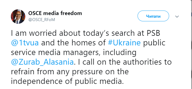 Представитель ОБСЕ по вопросам свободы СМИ Арлем Дезир высказал обеспокоенность из-за сообщения об обысках в офисе Национальной общественной телерадиокомпании Украины, а также в квартире председателя правления НСТУ Зураба Аласании. Об этом он написал в Twitter.