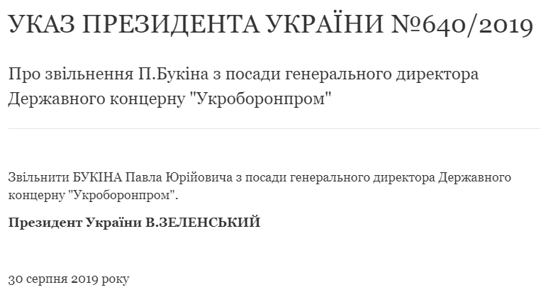 Перед этим президент Украины указом №640/2019 освободил Павла Букина с должности главы "Укроборонпрома".
