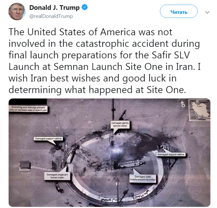 Вчера, 30 августа, президент США Дональд Трамп в микроблоге Twitter написал о непричастности США к взрыву ракеты в Иране и сопроводил твит фотографией засекреченного спутникового снимка. Об этом сообщает CNBC.