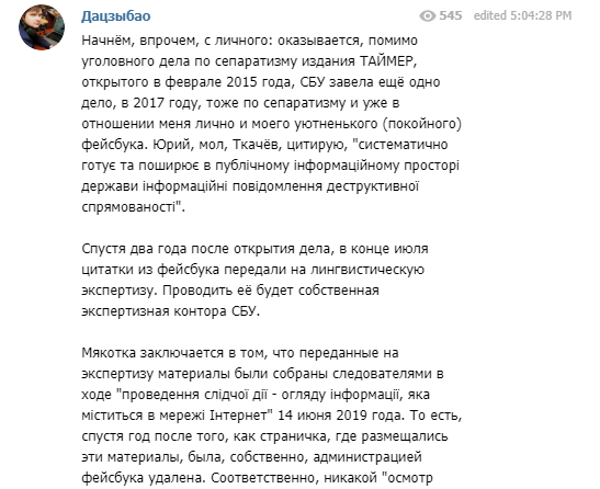 "Мякотка заключается в том, что переданные на экспертизу материалы были собраны следователями в ходе "проведення слідчої дії - огляду інформації, яка міститься в мережі Інтернет" 14 июня 2019 года. То есть, спустя год после того, как страничка, где размещались эти материалы, была, собственно, администрацией Facebook удалена. Соответственно, никакой "осмотр информации в сети интернет" в указанное следователем время уже тупо ничего не дал бы - нечего было "осматривать". То есть, даже и тут не обошлось без банальных фабрикаций", - рассказал он.