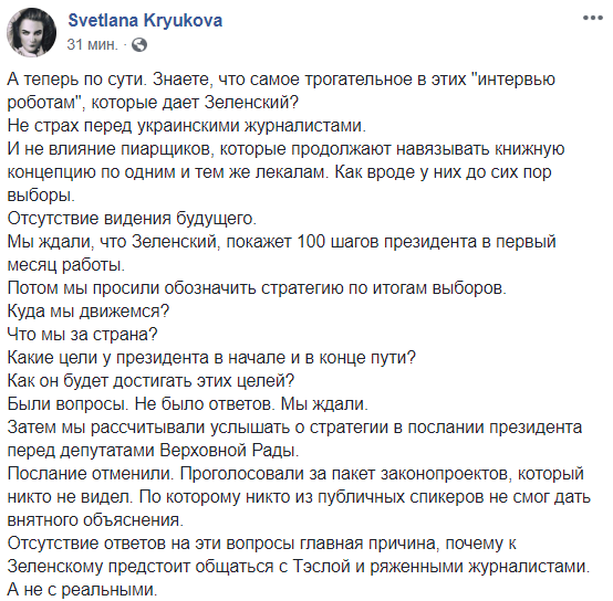 "Посмотрела "интервью" Зеленского актеру (а по сути, самому себе). Он ответил на вопросы, которые его самого волновали.
