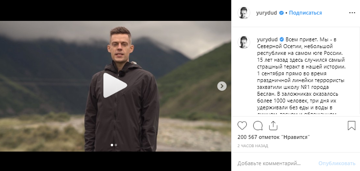2 сентября, в годовщину теракта в Беслане, вышел документальный фильм российского журналиста Юрия Дудя "Беслан. Помни". Он длится более трех часов, в нем Дудь, который вместе со своим шоу "ВДудь" уходил на летние каникулы, общается с теми, кто пережил трагедию в 2004 году, с журналистами.