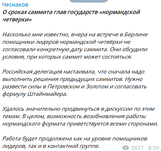 "Насколько мне известно, вчера на встрече в Берлине помощники лидеров "нормандской четверки" не согласовали конкретную дату саммита. Они обсудили условия, при которых саммит может состояться.