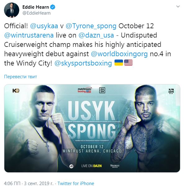 "Официально. Поединок Усик - Спонг состоится 12 октября на Wintrust Arena (Чикаго). В прямом эфире его покажет стримминговая компания DAZN", - говорится в сообщении.