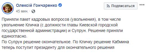 "Решение приняли единогласно. По Супрун решение окончательное ", - написал Гончаренко на своей странице в Facebook.