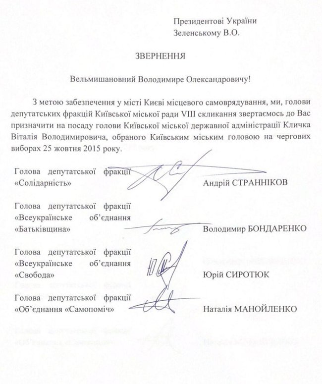 "С целью обеспечения в Киеве местного самоуправления мы, председатели депутатских фракций Киевского городского совета VIII созыва, обращаемся к Вам назначить на должность главы Киевской городской государственной администрации Кличко Виталия Владимировича, избранного Киевским городским головой на очередных выборах 25 октября 2015 года", - говорится в сообщении.