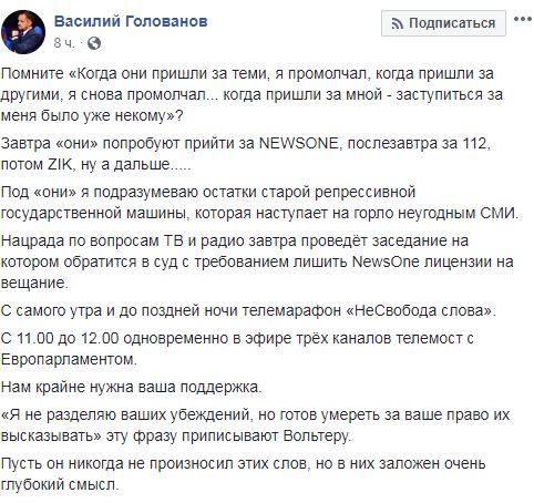"Помните "Когда они пришли за теми, я промолчал, когда пришли за другими, я снова промолчал... когда пришли за мной - заступиться за меня было уже некому"? Завтра "они" попробуют прийти за NEWSONE, послезавтра за 112, потом ZIK, ну а дальше...Под "они" я подразумеваю остатки старой репрессивной государственной машины, которая наступает на горло неугодным СМИ", - написал Голованов.