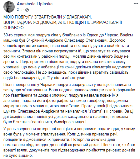 По информации девушки, инцидент произошел 30 августа. Ее 26-летняя подруга нашла через сервис 51-летнего водителя Александра Андриенко, который согласился довезти ее до Черкасс, где девушку ожидал молодой человек. При этом уточняется, что с ними в авто должен был ехать еще один попутчик, однако по неизвестной причине, его не оказалось.
