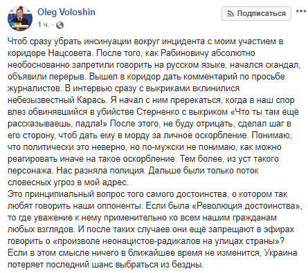 "В интервью сразу с выкриками вклинилися небезызвестный Карась. Я начал с ним пререкаться, когда в наш спор влез обвинявшийся в убийстве Стерненко с выкриком "Что ты там ещё рассказываешь, падла!" После этого, не буду отрицать, сделал шаг в его сторону, чтоб дать ему в морду за личное оскорбление. Понимаю, что политически это неверно, но по-мужски не понимаю, как можно реагировать иначе на такое оскорбление. Тем более, из уст такого персонажа. Нас разняла полиция. Дальше были только поток словесных угроз в мой адрес", - рассказал Олег Волошин.