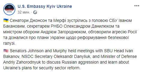 "Сенаторы Джонсон и Мерфи встретились с главой СБУ Иваном Бакановым, секретарем СНБО Александром Данилюком и министром обороны Андреем Загороднюком, обсудили агрессию России и узнали о планах Украины по реформированию сферы безопасности", - говорится в сообщении.