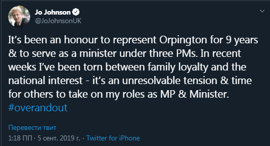 "Для меня было честью представлять Орпингтон в течение 9 лет и служить министром при трех премьер-министрах. На протяжении последних недель я разрывался между верностью семье и национальными интересами. Это неразрешимые противоречия. Теперь пришло время другим заменить меня в должности депутата и министра", - сообщил Джо Джонсон, выступающий против планов брата.