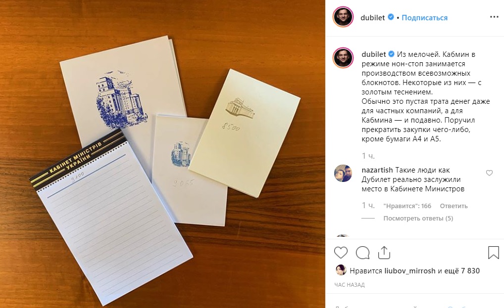 "Кабмин в режиме нон-стоп занимается производством всевозможных блокнотов. Некоторые из них - с золотым теснением. Обычно это пустая трата денег даже для частных компаний, а для Кабмина - и подавно. Поручил прекратить закупки чего-либо, кроме бумаги А4 и А5", - написал Дубилет в соцсети.