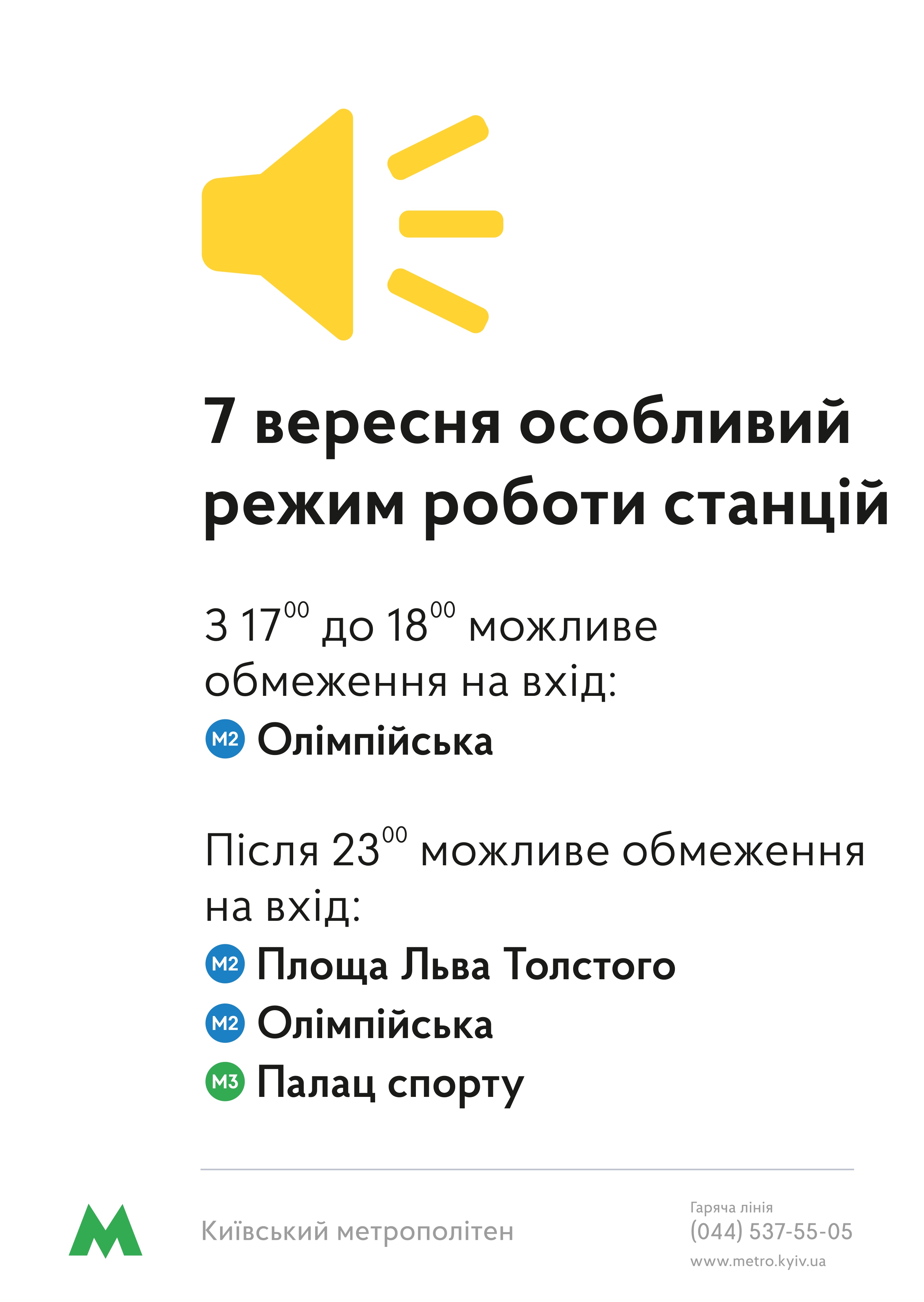 Отмечается, что перед началом концерта возможно ограничение (закрытие) на вход для пассажиров на станцию "Олимпийская". После его окончания с целью обеспечения надлежащей перевозки пассажиров возможно ограничение на вход на станции "Дворец спорта", "Олимпийская" и "Площадь Льва Толстого".