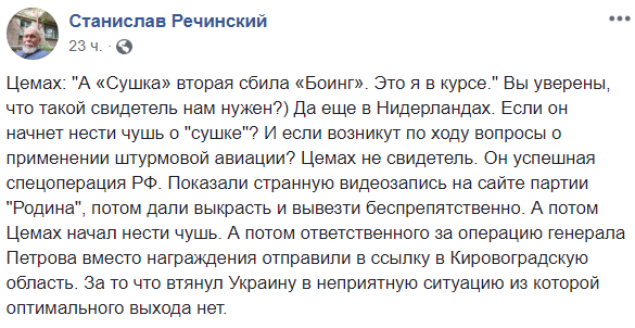 "Цемах: "А "Сушка" вторая сбила "Боинг". Это я в курсе." Вы уверены, что такой свидетель нам нужен?) Да еще в Нидерландах. Если он начнет нести чушь о "сушке"? И если возникут по ходу вопросы о применении штурмовой авиации? Цемах не свидетель. Он успешная спецоперация РФ. Показали странную видеозапись на сайте партии "Родина", потом дали выкрасть и вывезти беспрепятственно. А потом Цемах начал нести чушь. А потом ответственного за операцию генерала Петрова вместо награждения отправили в ссылку в Кировоградскую область. За то что втянул Украину в неприятную ситуацию из которой оптимального выхода нет", - пишет Речинский.