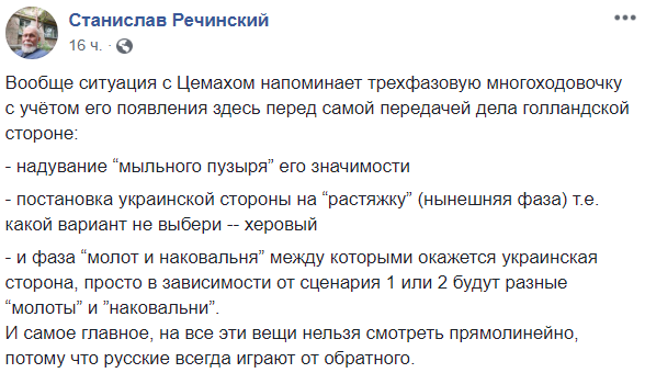 По его мнению, "ситуация с Цемахом напоминает трехфазовую многоходовочку с учётом его появления здесь перед самой передачей дела голландской стороне: