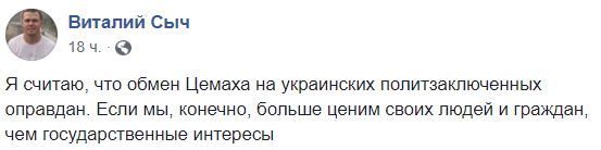 "Я считаю, что обмен Цемаха на украинских политзаключенных оправдан. Если мы, конечно, больше ценим своих людей и граждан, чем государственные интересы", - пишет журналист Виталий Сыч.